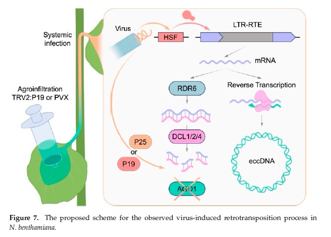 LTR-ретротранспозоны составляют значительную часть геномов растений и могут активироваться в ответ на различные стрессы. Вирусные инфекции способны индуцировать транскрипционную активацию ретротранспозонов, однако остается неясным, может ли за этим следовать их перемещение (транспозиция). С использованием нанопорового секвенирования авторы изучили три вида растений (Arabidopsis thaliana, Brassica napus и Nicotiana benthamiana) при заражении РНК-вирусами (TRV, PVX и TRSV) и обнаружили вирус-специфичные изменения транскриптома. Наиболее выраженный эффект продемонстрировал вирус PVX, вызвавший одновременную транскрипционную активацию нескольких семейств ретротранспозонов у N. benthamiana. Ключевым открытием стало обнаружение внехромосомных кольцевых ДНК, образуемых ретротранспозонами N. benthamiana в ответ на заражение TRV с экспрессией вирусного супрессора сайленсинга P19. Это наблюдение указывает на способность вирусной инфекции стимулировать потенциальную транспозицию ретротранспозонов. Полученные результаты раскрывают связь между противовирусной защитой растений и регуляцией мобильных элементов генома, демонстрируя существование эволюционного интерфейса, который может иметь долгосрочные последствия для адаптации и эволюции растительных геномов.